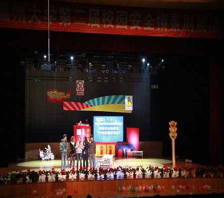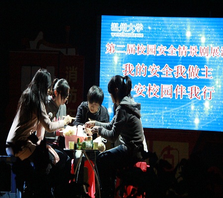 2011年12月8日晚7点,温州大学第二届校园安全情景剧展演在大学生活动中心演艺厅举行。本次活动由温州大学保卫处、温州大学学生处、温州大学团委主办,承办方为温州大学、瓯江学院,协办方为商学院、教育学院、人文学院、化材学院、生环学院、城市学院。参加本次活动的有温州大学副校长任博强,高教园区管委会综合治理处处长李学军,茶山派出所副处长林力军、王炳云以及各职能部门、学院的老师和同学。